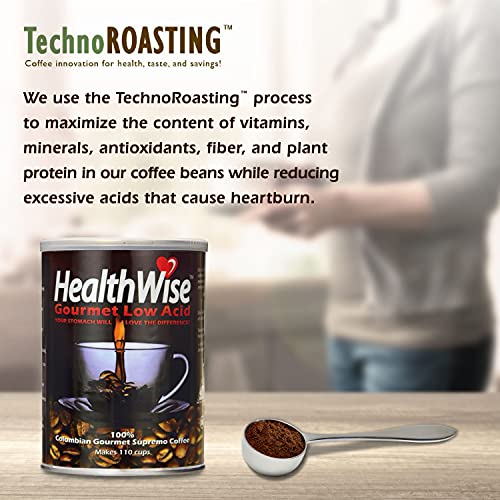 Price: (as of – Details) HealthWise 100% Colombian Supremo, Low Acid Ground Coffee, 12-Ounce Cans (Pack of 2) Item Weight : 12 Ounces Manufacturer : HealthWise Gourmet Coffees LLC ASIN : B0081RRBRE